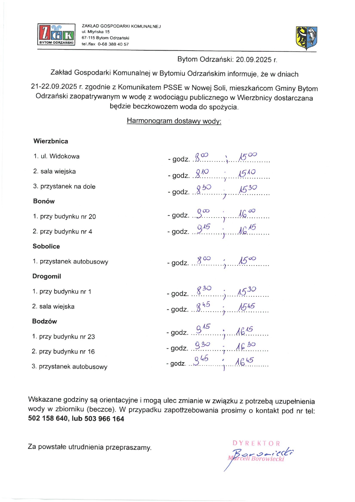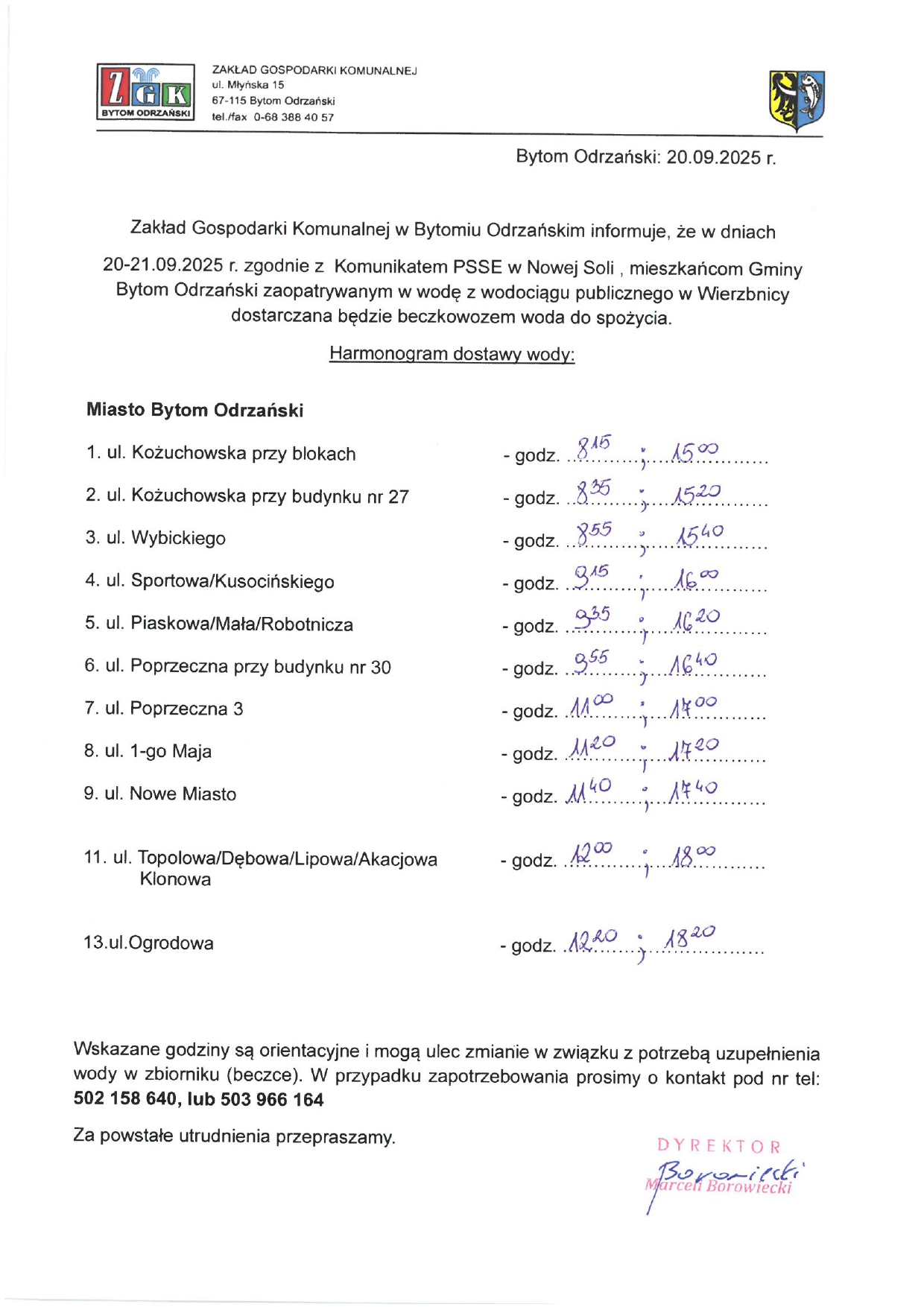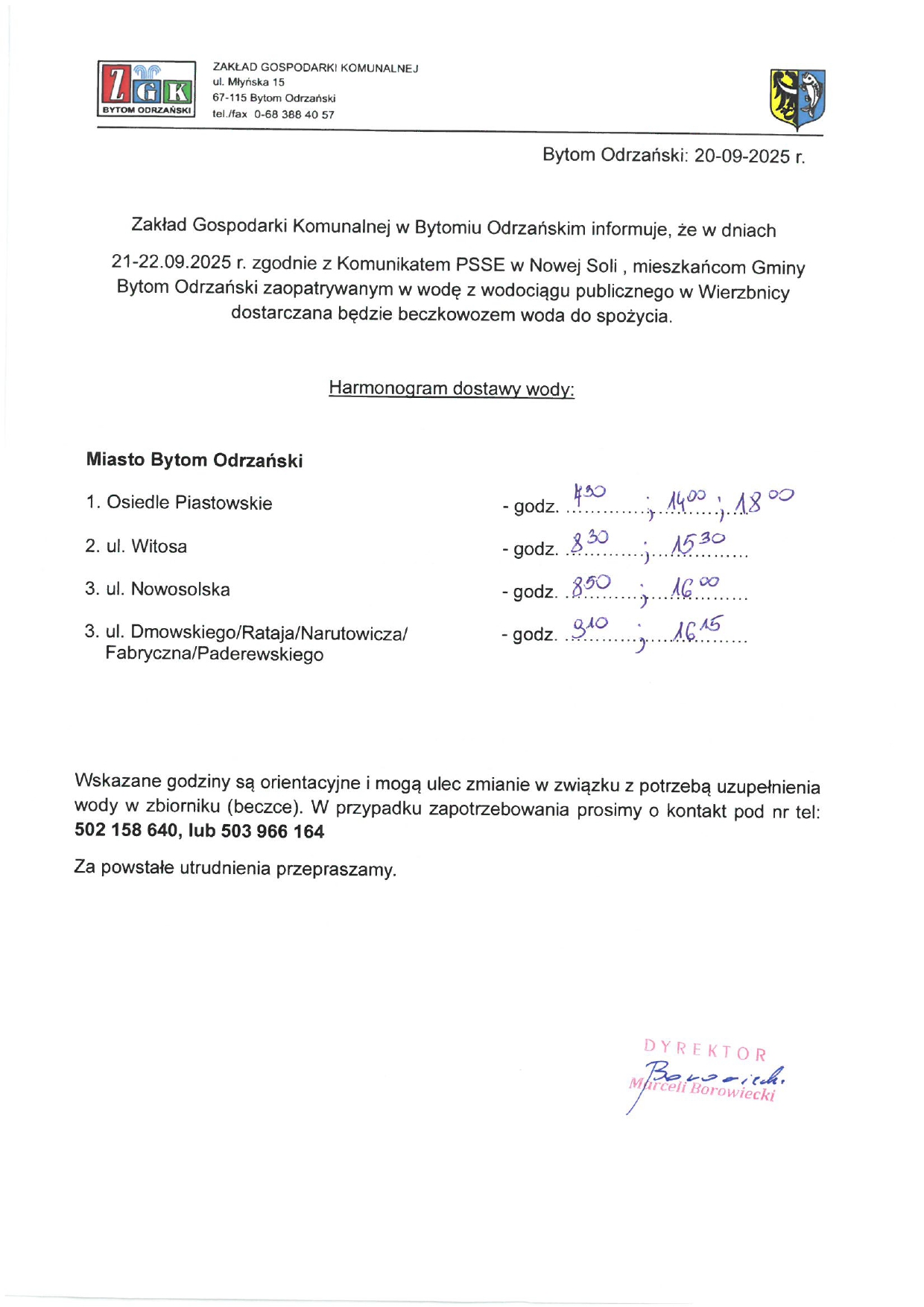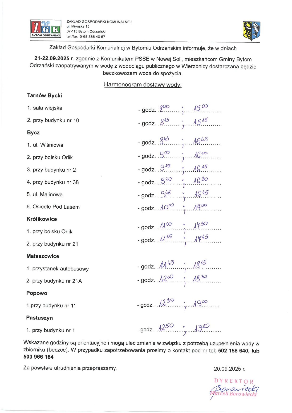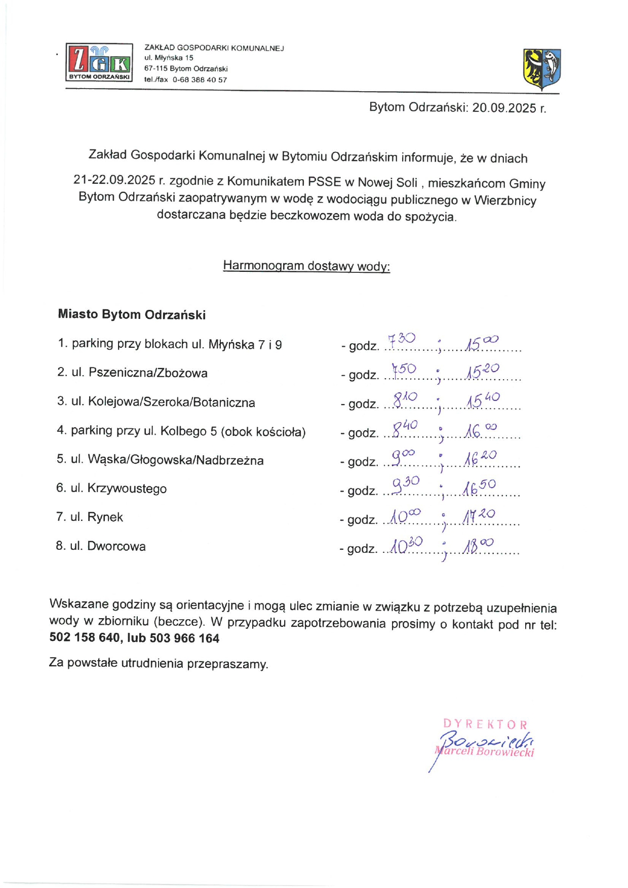 Harmonogram dostaw wody do spożycia na 21 i 22 września Poniżej harmonogram dostaw wody do spożycia na terenie Gminy Bytom Odrzański na 21 i 22 września. Ze względów logistycznych podane godziny są orientacyjne i mogą ulec nieznacznym zmianom. Tomek Chmielewski2025-09-20T23:05:56+02:002025-09-20|Aktualności| Udostępnij FacebookTwitterLinkedInWhatsAppEmail