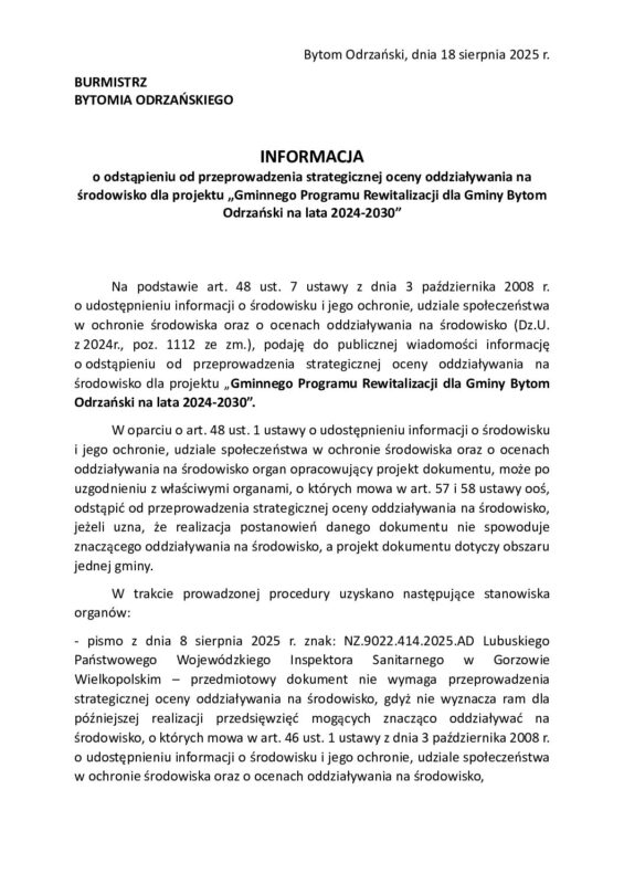 INFORMACJA o odstąpieniu od przeprowadzenia strategicznej oceny oddziaływania na środowisko dla projektu „Gminnego Programu Rewitalizacji dla Gminy Bytom Odrzański na lata 2024-2030”