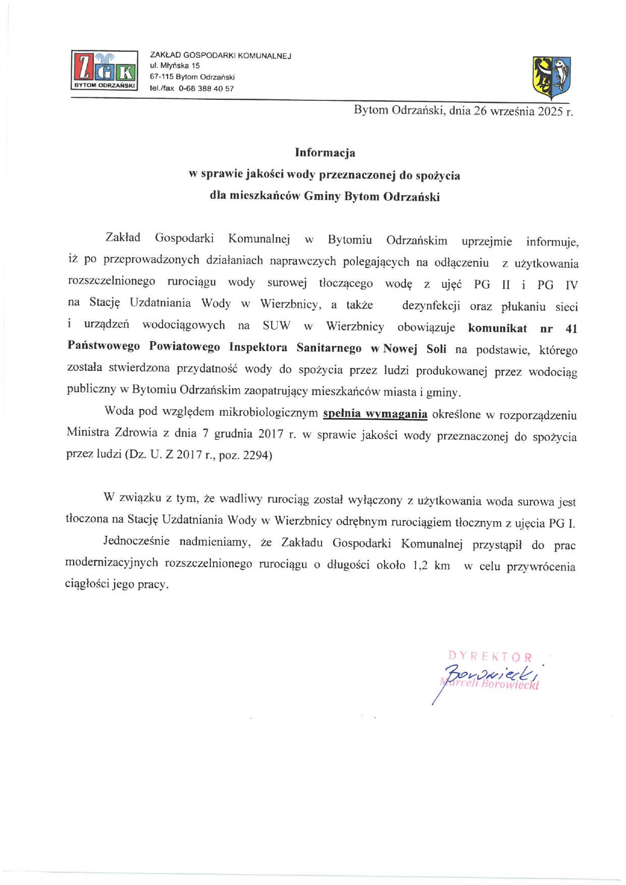 Komunikat Dyrektora Zakładu Gospodarki Komunalnej Komunikat Dyrektora Zakładu Gospodarki Komunalnej w sprawie jakości wody Tomek Chmielewski2025-09-26T15:33:18+02:002025-09-26|Aktualności| Udostępnij FacebookTwitterLinkedInWhatsAppEmail