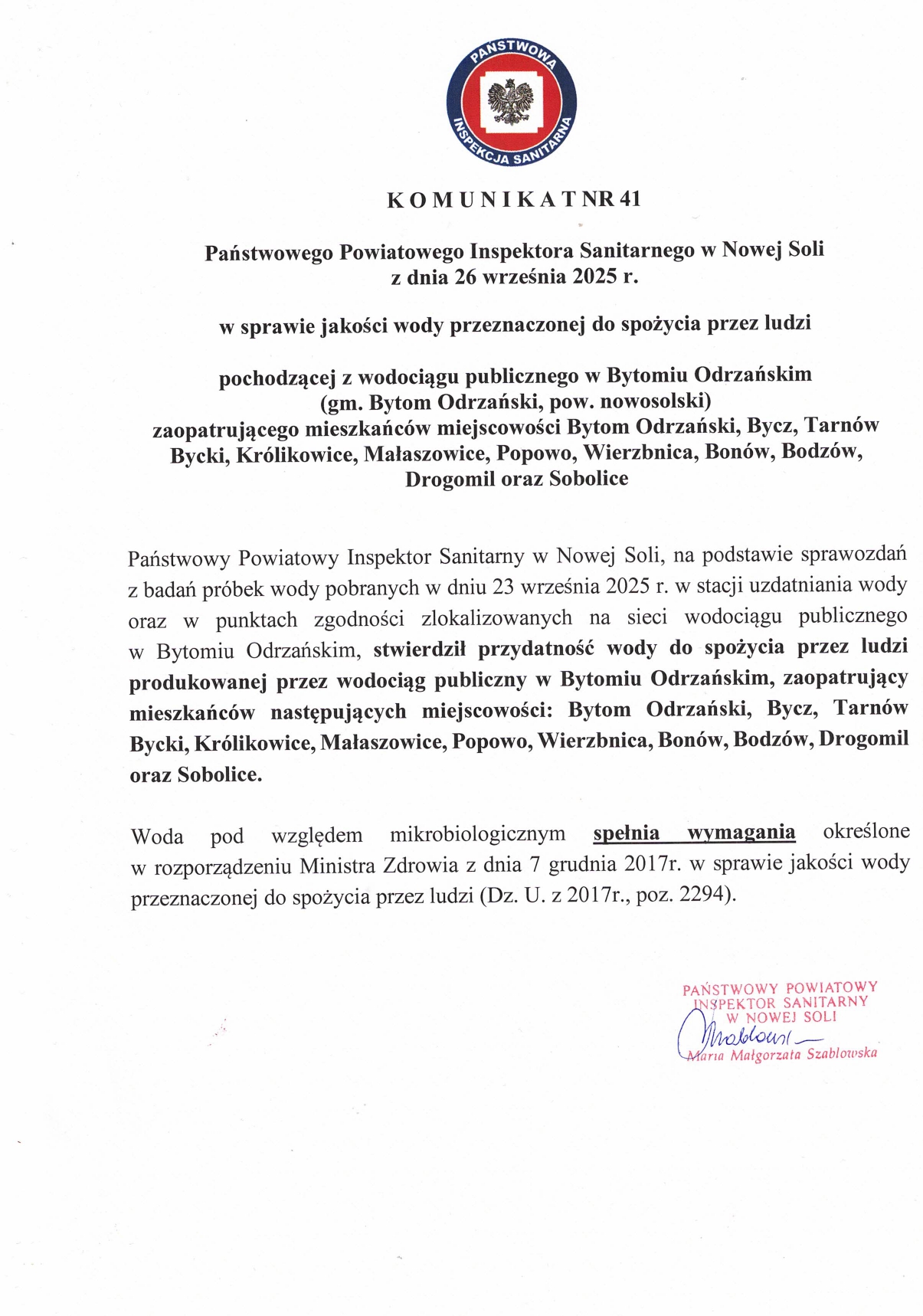 Komunikat w sprawie jakości wody Komunikat nr 41 Państwowego Powiatowego Inspektora Sanitarnego w Nowej Soli – przywrócenie przydatności wody Tomek Chmielewski2025-09-26T13:22:46+02:002025-09-26|Aktualności| Udostępnij FacebookTwitterLinkedInWhatsAppEmail